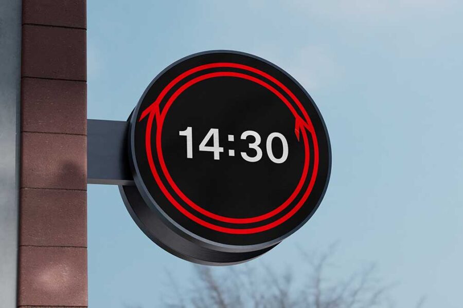 It features the two halves of the Double Arrow circling around two red tracks, meeting at the top and bottom of the clockface every 30 seconds. Margaret Calvert’s Rail Alphabet 2 shines brightly in the centre – showing just hours and minutes on the 1.8 metre-diameter version which has been unveiled at London Bridge, to be joined by seconds on information screens and at platforms where those seconds really count.